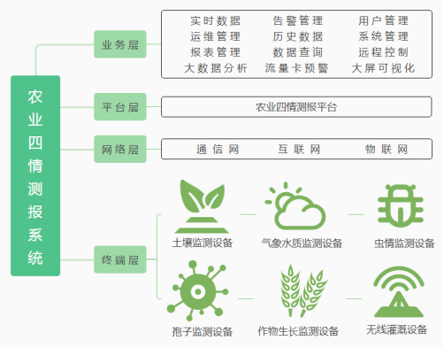 农业四情监测系统将物联网数据采集技术、无线通讯技术、大数据管理与分析与农业生产相结合,实现能耗的降低,科学的种植,系统化、规模化的精细管理。通过实时掌握植物的生长环境信息,建立种植过程中的大数据库。通过实时采集农业生产过程中的土壤环境、气象情况、水质环境、虫情状况、孢子状况、农作物生长状况等基础数据,从而根据不同农作物、不同生长周期内所需各种良好条件制定出科学有效的措施。从而保证在最小资源使用的情况下,对作物所需水分及环境进行科学的自动化反馈。从而最大限度内提高作物产量,改善农产品的品质,节约不必要的人力,杜绝安全隐患。